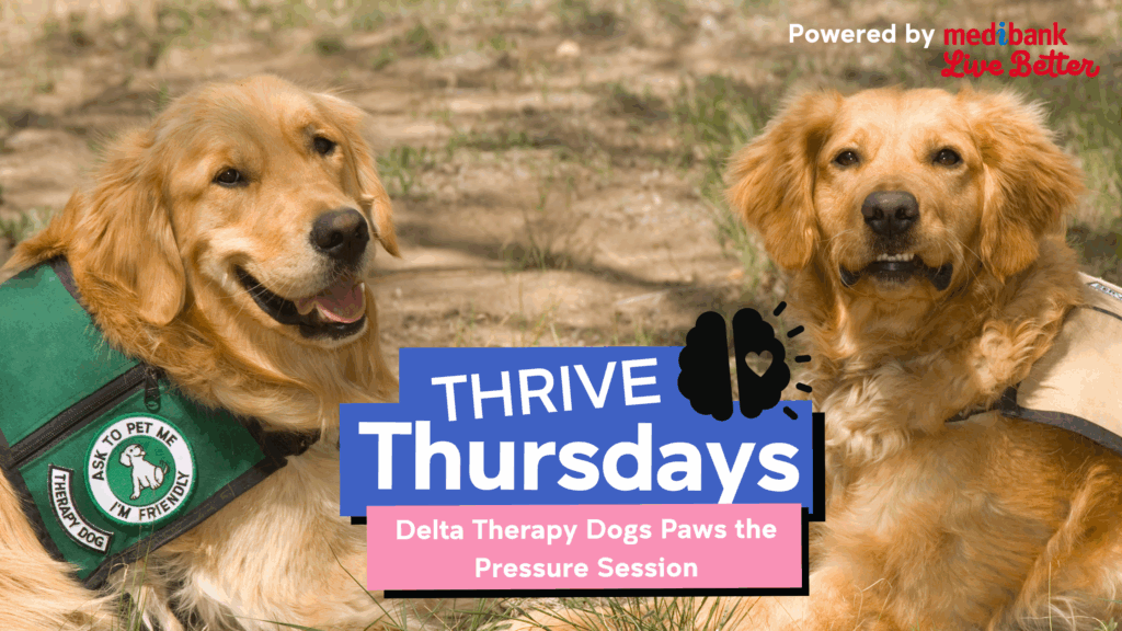 The Delta Dogs Paws The Pressure session provides stress relief and improves well-being through canine interaction. Inviting all students to take a moment to stop and PAWS, by dropping into 131 and enjoying joy calming cuddles and friendly paw-shakes with the delta therapy dogs, along with friendly chats with the volunteer handlers, our amazing health wellbeing ambassadors and student wellbeing advisors.