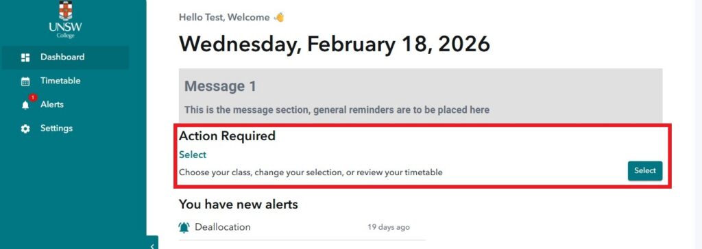 3. Once you click the Select button, you will be redirected to your timetable page