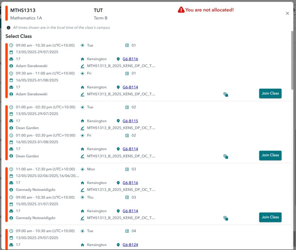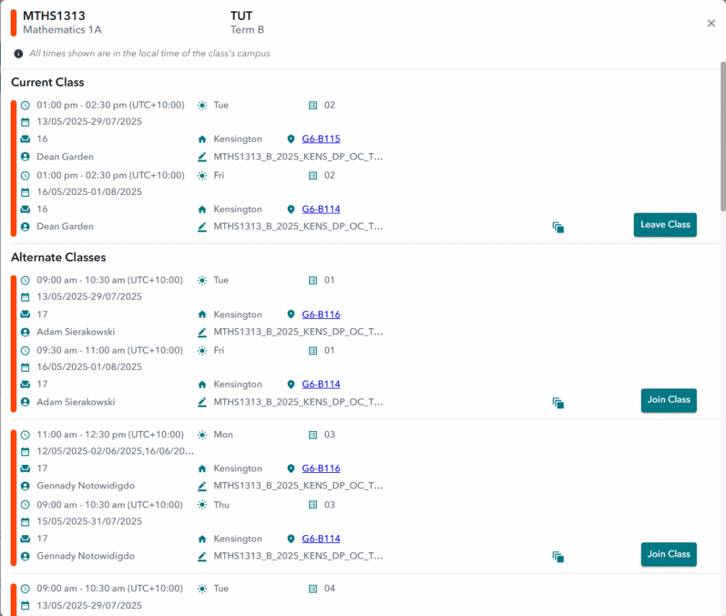 - To change the class, simply click ‘Join Class’ for any of the other classes under the Alternate Classes section and a prompt will appear asking you to confirm the change.