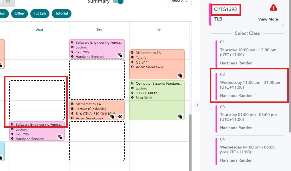 - Once you choose one, you will see one of the boxes in broken line be shaded out for a more visual idea on what time that subject is in the timetable.